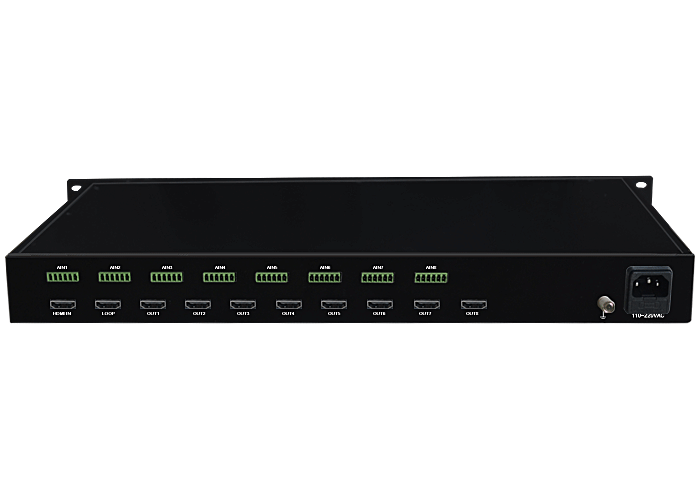 模拟音頻4K HDMI嵌入器,1路4K HDMI輸入,環路直通輸出,8路嵌入分配輸出,8路模拟音頻卡侬/端子/3.5mm/RCA接口輸入,獨立/冗餘供電,壁挂,通用型 |