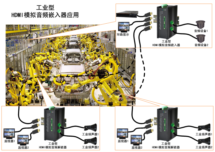 模拟音頻4K HDMI嵌入器,1路4K HDMI輸入,環路直通輸出,4路嵌入分配輸出,4路模拟音頻卡侬/端子/3.5mm/RCA接口輸入,獨立/冗餘/總線供電(DC18~36V/5V),導軌,工業型 |