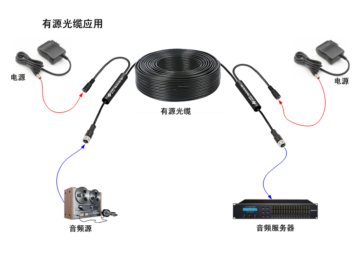 數字音頻有源光纜AOC/光纖導線支持5V、12V(9~18V) 、24V(18~36V)、48V(36~72V)直流電源輸入設計,也可通過(guò)有源光纜中電纜混合的方式遠距離供電。