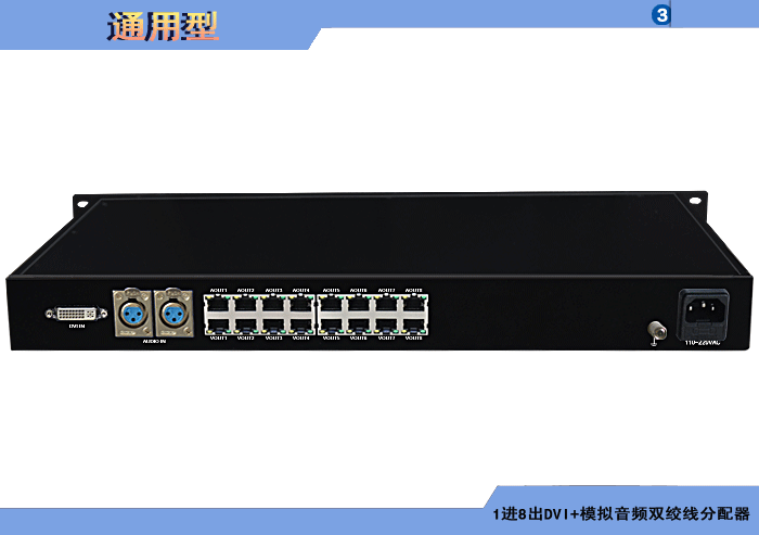 1進(jìn)8出DVI模拟音頻雙絞線分配器,内置數字均衡器/抖動去除器可選,卡侬/端子/3.5mm/RCA接口,獨立/冗餘供電,壁挂,通用型 |