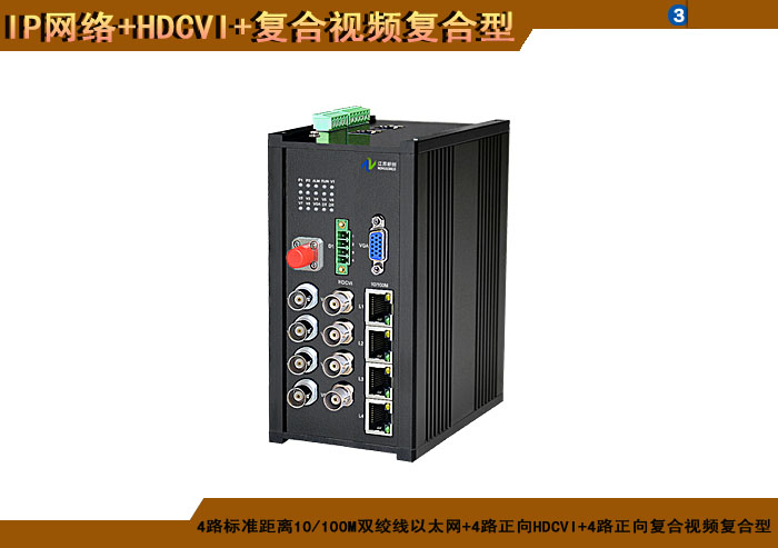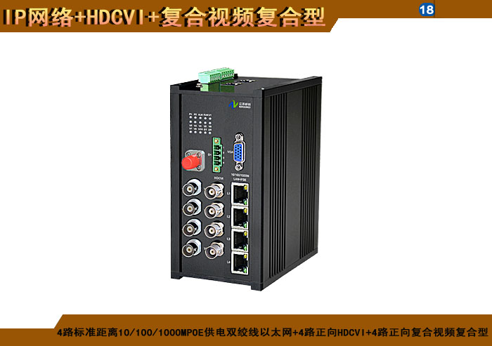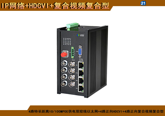 4路标準距離10/100/1000M雙絞線以太網+4路正向(xiàng)HDCVI+4路正向(xiàng)複合視頻複合信号型光端機發(fā)射機/接收機,1/2/4/8擴容口可選,複合信号可選,單模/多模/塑料,1/2纖,ST/FC/SC/LC/SFP光接口,15/20/25/32dB,獨立/冗餘/總線供電(DC18~36V/5V),導軌,工業型,非網管/網管/帶光纖數字診斷網管 |
