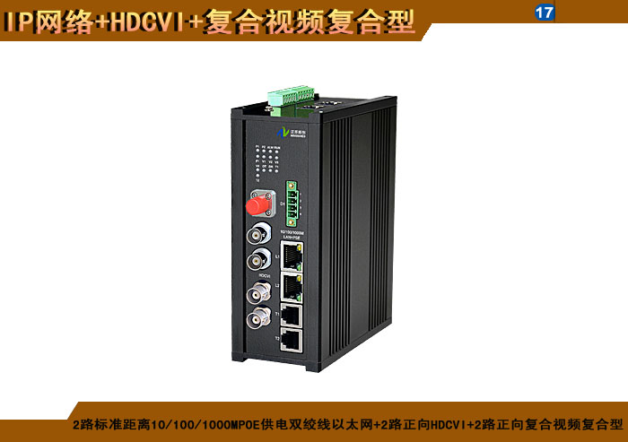 2路标準距離10/100/1000MPOE供電雙絞線以太網+2路正向(xiàng)HDCVI+2路正向(xiàng)複合視頻複合信号型光端機發(fā)射機/接收機,1/2/4/8擴容口可選,複合信号可選,單模/多模/塑料,1/2纖,ST/FC/SC/LC/SFP光接口,15/20/25/32dB,獨立/冗餘/總線供電(DC18~36V/5V),導軌,工業型,非網管/網管/帶光纖數字診斷網管 |