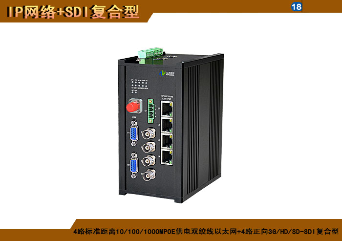 4路标準距離10/100/1000MPOE供電雙絞線以太網+4路正向(xiàng)3G/HD/SD-SDI複合信号型光端機發(fā)射機/接收機,1/2/4/8擴容口可選,複合信号可選,單模/多模/塑料,1/2纖,ST/FC/SC/LC/SFP光接口,15/20/25/32dB,獨立/冗餘/總線供電(DC18~36V/5V),導軌,工業型,非網管/網管/帶光纖數字診斷網管 |