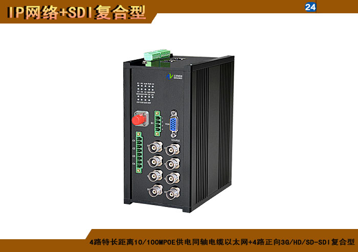 4路特長(cháng)距離10/100MPOE供電雙絞線以太網+4路正向(xiàng)3G/HD/SD-SDI複合信号型光端機發(fā)射機/接收機,1/2/4/8擴容口可選,複合信号可選,單模/多模/塑料,1/2纖,ST/FC/SC/LC/SFP光接口,15/20/25/32dB,獨立/冗餘/總線供電(DC18~36V/5V),導軌,工業型,非網管/網管/帶光纖數字診斷網管 |