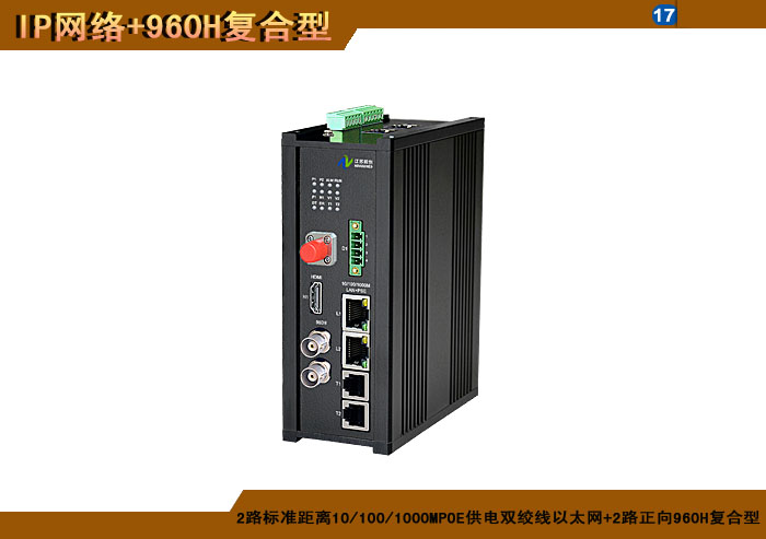 2路标準距離10/100MPOE供電雙絞線以太網+2路正向(xiàng)960H複合信号型光端機發(fā)射機/接收機,1/2/4/8擴容口可選,複合信号可選,單模/多模/塑料,1/2纖,ST/FC/SC/LC/SFP光接口,15/20/25/32dB,獨立/冗餘/總線供電(DC18~36V/5V),導軌,工業型,非網管/網管/帶光纖數字診斷網管 |