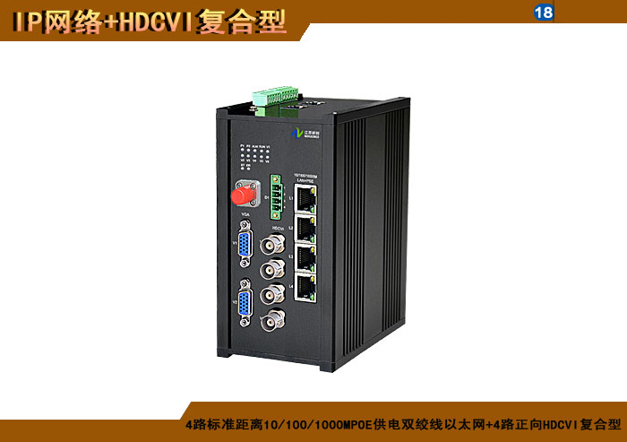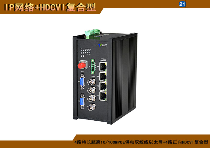4路特長(cháng)距離10/100MPOE供電雙絞線以太網+4路正向(xiàng)HDCVI複合信号型光端機發(fā)射機/接收機,1/2/4/8擴容口可選,複合信号可選,單模/多模/塑料,1/2纖,ST/FC/SC/LC/SFP光接口,15/20/25/32dB,獨立/冗餘/總線供電(DC18~36V/5V),導軌,工業型,非網管/網管/帶光纖數字診斷網管 |